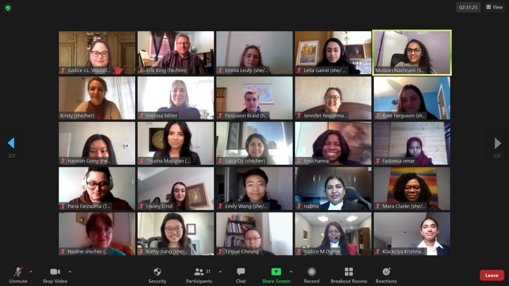 In previous years the Braiding Diversity into Justice program has been a full-day activity including sessions at the Waterloo Courthouse and visits to local law firms.  This year, as a result of the Covid-19 pandemic, the event was modified to become a 2-hour activity delivered through Zoom video conferencing.