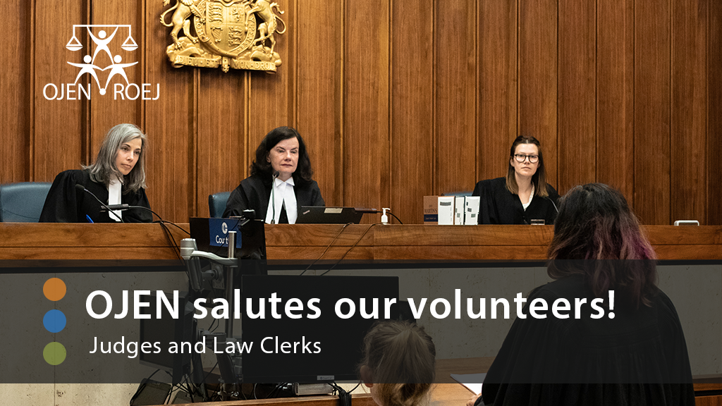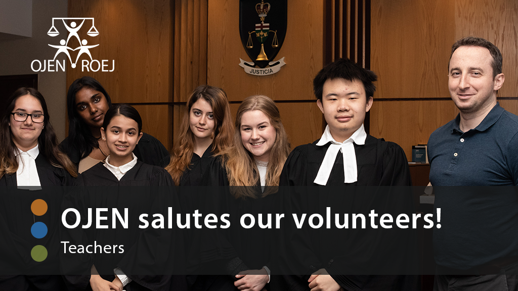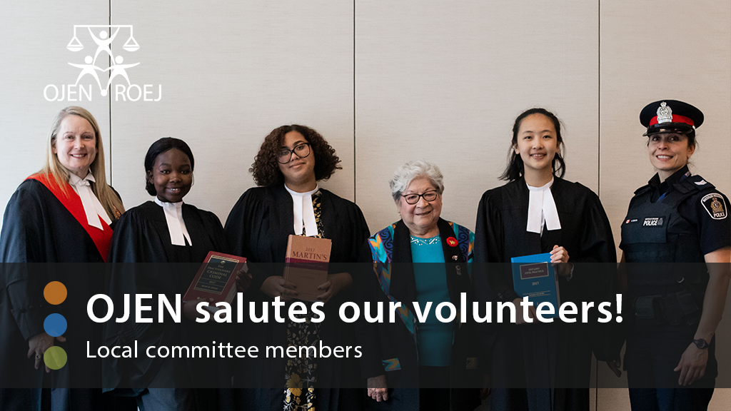 OJEN owes much of its success to an incredibly dedicated and highly skilled volunteer base. During National Volunteer Week, April 18th to 24th, OJEN took to social media to thank all of the judges, lawyers, court staff, police officers, educators, law students and others who give their time and expertise in support of our justice education programs. Coaching mock trials, delivering workshops, developing classroom resources and so much more – they bring the law to life for thousands of youth throughout Ontario every year.