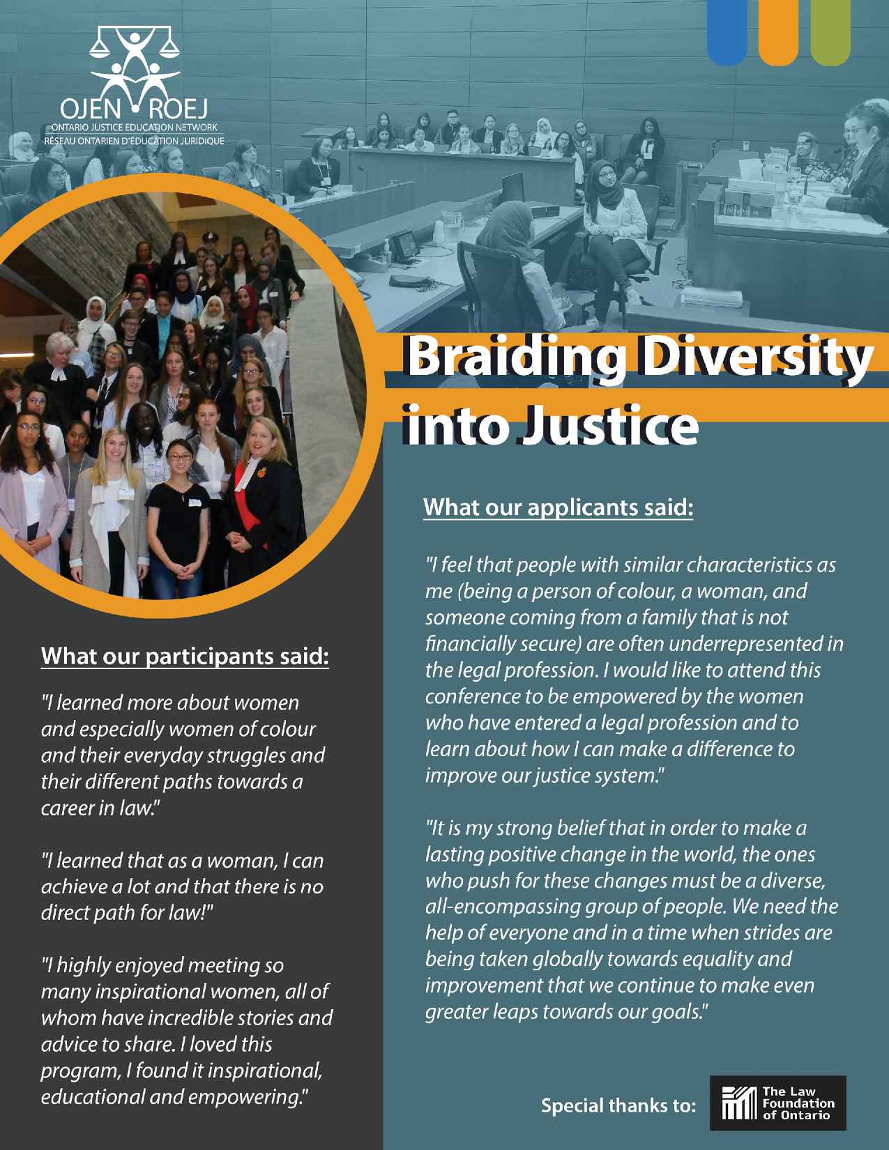 Braiding Diversity into Justice is an annual event first offered in the Kitchener-Waterloo area in 2018. Its goal is to connect marginalized and/or racialized young women (cis and trans) between the ages of 16 and 20 with women working in the legal sector. Gender fluid and non-binary youth are also welcome. There is a place for everyone in the legal profession regardless of socio-economic status, disability, migration, sexual orientation, gender identity or expression, ethnicity, or religion. Find inspiration from diverse women who are successful legal/justice sector professionals.