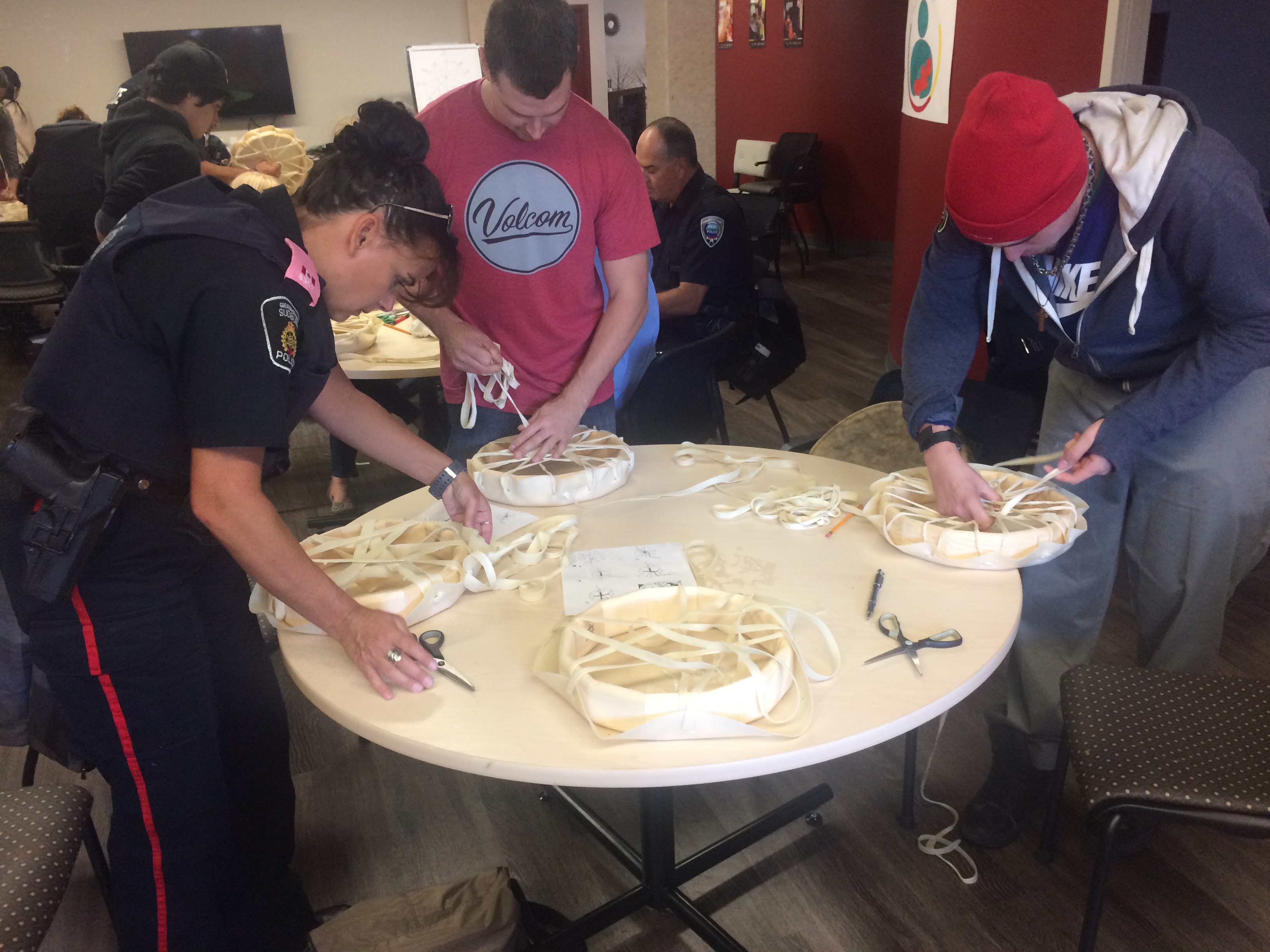 A unique feature of the Sudbury program was the drum making workshop. Over the two days of the program, youth and officers spent time together building traditional hand drums – cutting circles from deer hide for the drum head, soaking them so they were flexible enough to stretch over the hoops and then lacing them to the hoops with rawhide strips. It was the spontaneous exchanges that occurred in the casual atmosphere of this activity that the program went from being successful to transformational.